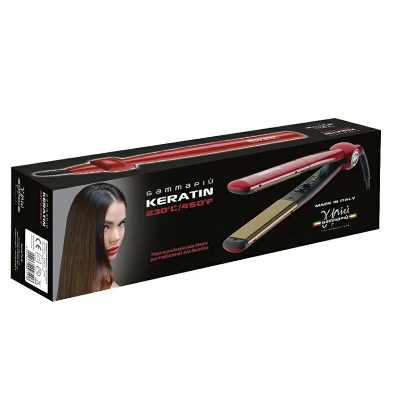 Lisseur GAMMA PIU KERATIN / Température : 230°C / Plaques flottantes à chauffe rapide revêtues de Titan / Restitution parfaite des traitements à la kératine / Grande surface lissante / Contrôle électronique de la température / Protection anti-chaleur avec peigne