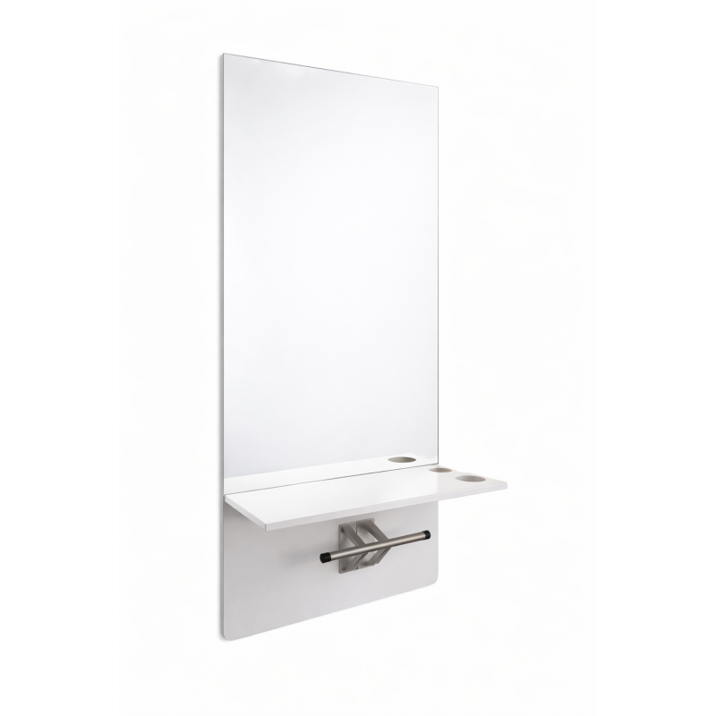Son grand miroir vertical assure une visibilité optimale pour le coiffeur et le client, tandis que la console intégrée permet de poser les outils et accessoires essentiels pendant la prestation.