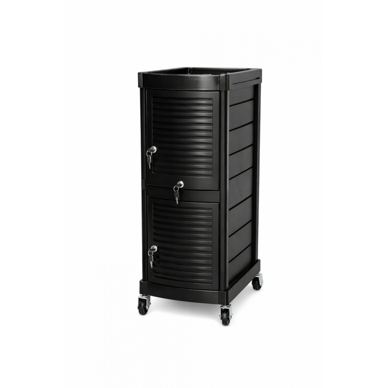 Ce chariot de coiffure professionnel noir avec portes nervurées et serrures est conçu pour les coiffeurs qui recherchent sécurité maximale, discrétion et organisation parfaite.
