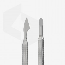 La partie active, le "pousseur oblique", est utilisée pour soulever et repousser une cuticule rugueuse et fortement collée, nettoyer le bord libre de l'ongle, éliminer les stries de vernis gel.
